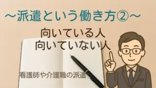 はじめに前回、看護師や介護職における「派遣の仕組みと特徴」について紹介しました。今回はその続編として、『派遣が向いている人・向いていない人』『派遣を上手に活かすコツ』について、人事担当者の目線からお伝えします。派遣は“自由度の高い働き方”で...